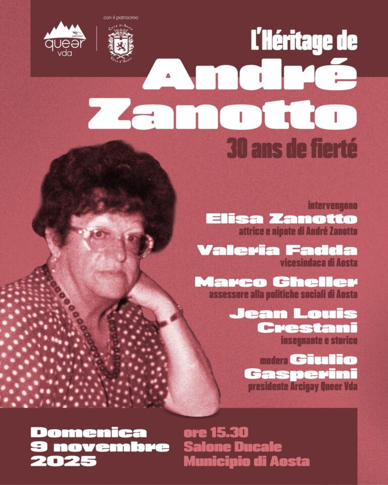 A trent’anni dalla sua scomparsa, Arcigay Queer VdA, con il patrocinio del Comune di Aosta, celebra la figura di André Zanotto (Losanna 1933 – Aosta 1995), storica, giornalista e scrittrice tra le protagoniste più significative della cultura valdostana del Novecento. 🏆 Premiata al Premio Saint-Vincent nel 1956 e autrice di
